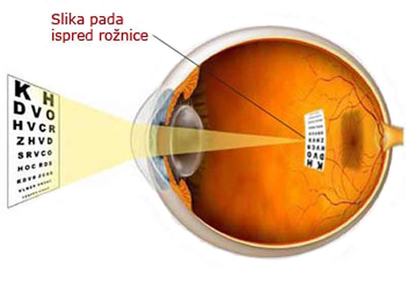 Miopija je problem vida uzrokovana "predugim" okom, što znači da je udaljenost između rožnice i mrežnice prevelika. U takvim slučajevima slika se formira ispred mrežnice što znači da miopi imaju problema s gledanjem predmeta na većoj udaljenosti a ne bližih. Što je osoba kratkovidnija više se mora približiti objektu da bi vidjela jasnije.
